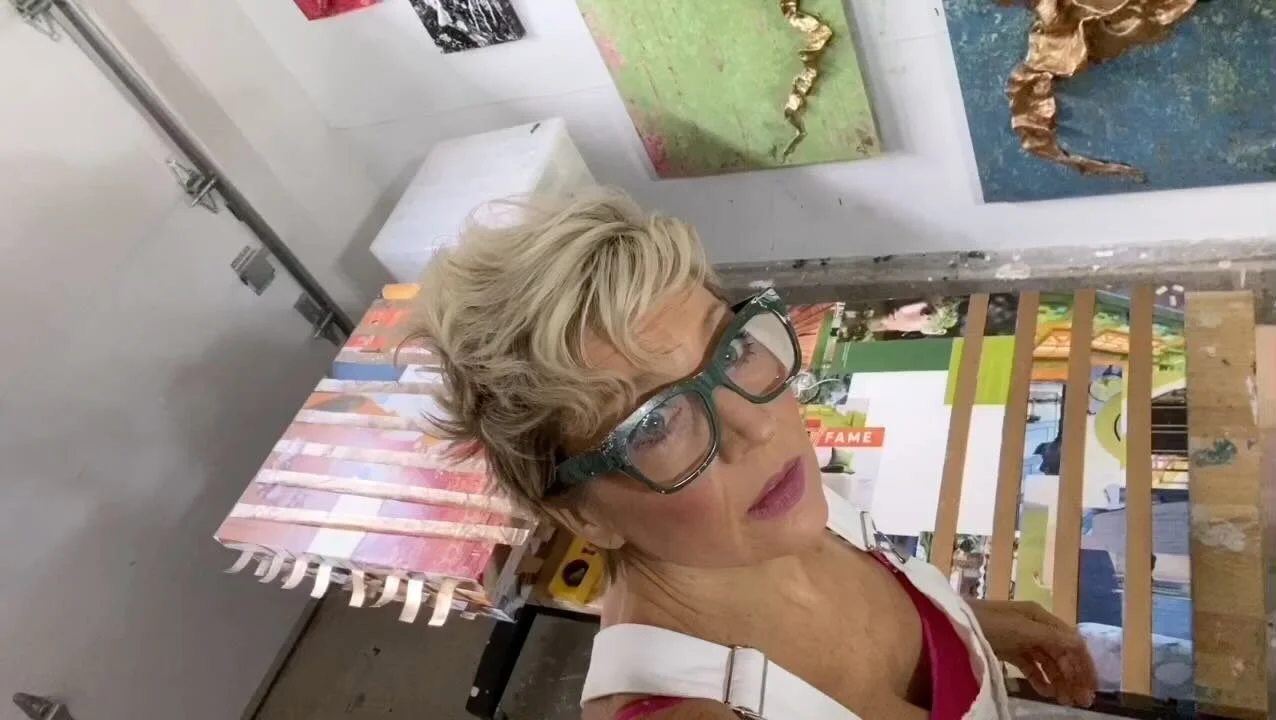 Current materials include aluminum mesh, paper, plaster, gold leaf, acrylic, oil and spray paint.